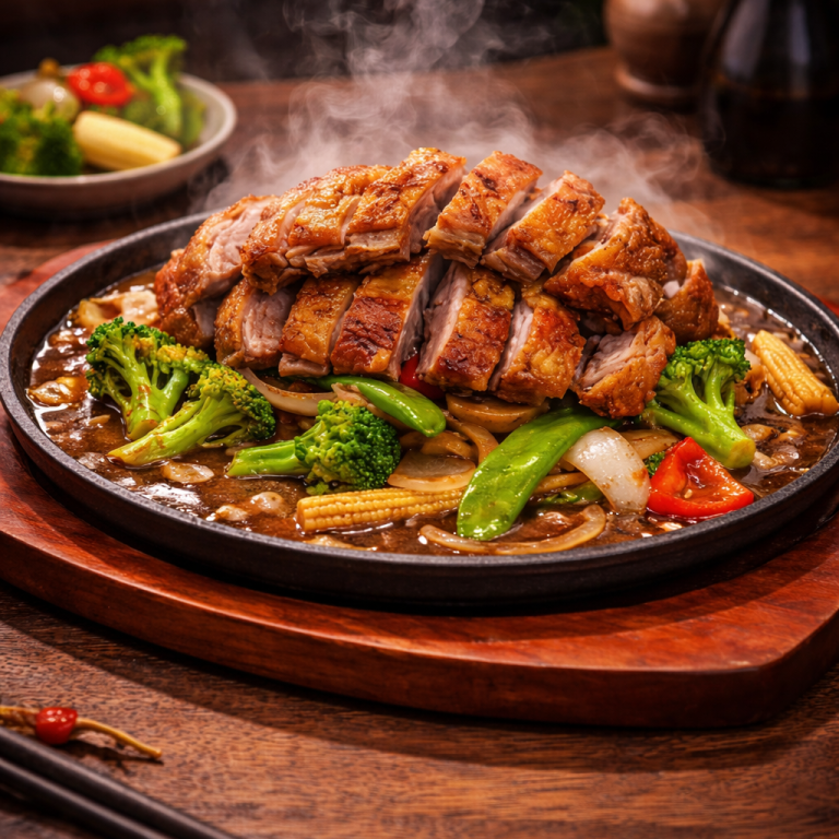 Knackig gebratenes Saisongemüse entfaltet auf der heißen Gusseisenplatte sein volles Aroma und wird von einer tiefwürzigen, dunklen Sauce umhüllt. Die intensive Hitze sorgt für ein unverwechselbares Dufterlebnis direkt am Tisch. Dazu servieren wir duftenden, locker gedämpften Jasminreis sowie eine Beilage ganz nach Ihrem Geschmack.
