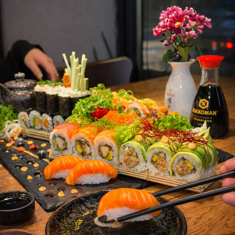 Lassen Sie sich überraschen und genießen Sie eine sorgfältig zusammengestellte Auswahl unserer frisch zubereiteten Sushi-Spezialitäten. Dieses Set für zwei Personen vereint eine harmonische Mischung aus klassischen und kreativen Variationen – von feinem Nigiri über abwechslungsreiche Maki bis hin zu besonderen Chef-Empfehlungen.