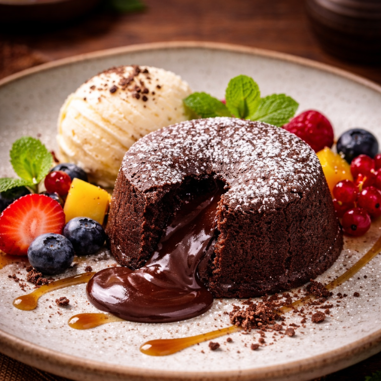 Warmer Schokoladenkuchen mit zart schmelzendem, flüssigem Kern, serviert mit cremigem Vanilleeis und frischen, saisonalen Früchten