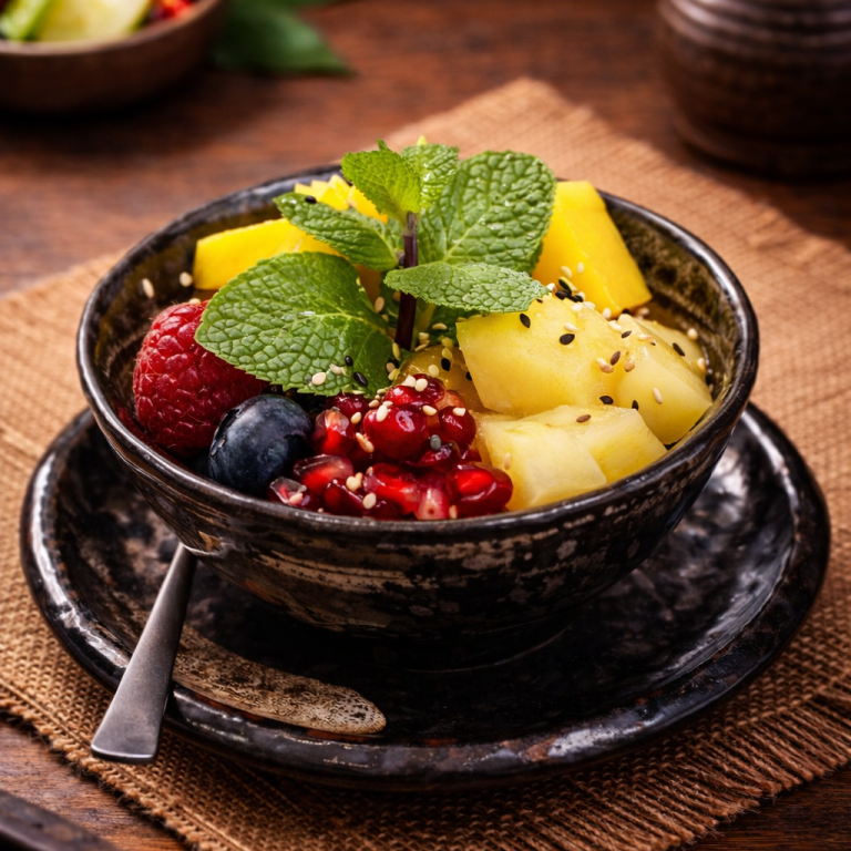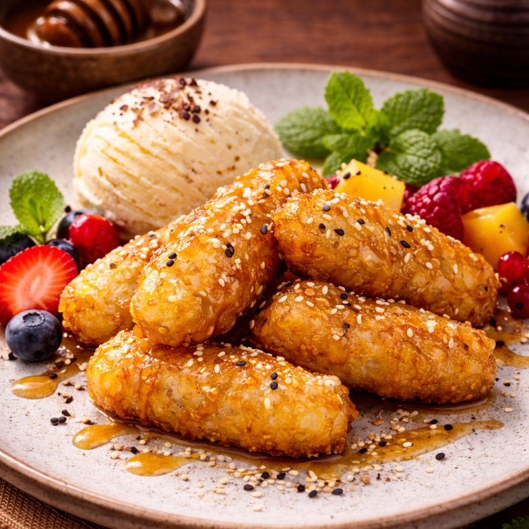 Knusprig gebackene Bananen, verfeinert mit aromatischem Honig und geröstetem Sesam, serviert mit cremigem Vanilleeis und frischen, saisonalen Früchten.